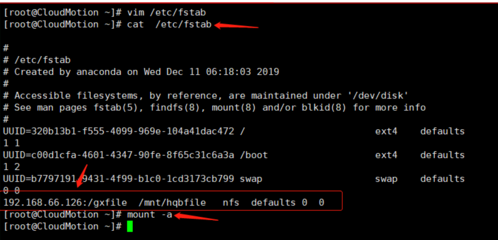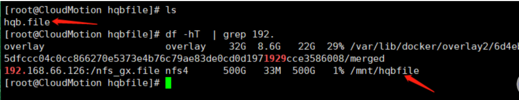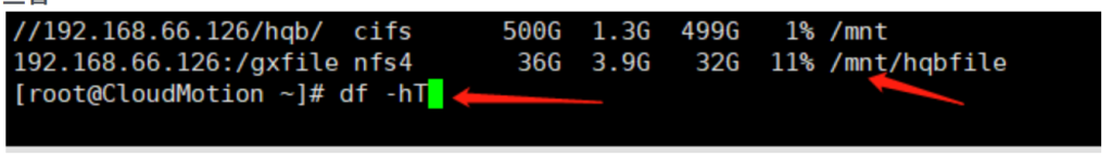 [root@CloudMotion ]# mkdir /mnt/hqbfile [root@CloudMotion ]# mount 192.168.66.126:/gxfile /mnt/hqbfile